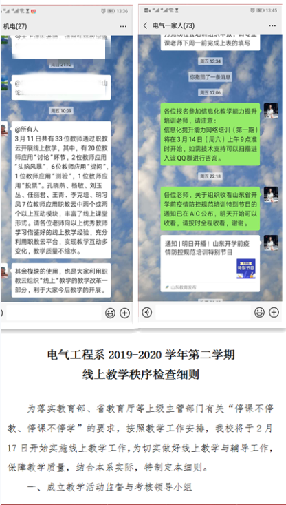 为了保证教学质量不降低、教学效果不打折,系部总体部署,及早制定《电气工程系在线教学工作实施方案》,成立系教学资源建设专家组,指导课程资源高质量开发建设,同时系部各科室上下一心、攻坚克难,迅速完成了课程摸排、网络测试、技术咨询、教师线上教学培训等前期工作,保障系部如期“开学”。教学运行期间,系部成立督导组遵循“一日四查”制度,进入网上课堂“听课“、“看课”,开展线上教学督导,实时在系部教学工作群反馈交流课堂教学情况,总结教学亮点,协调解决问题,确保“教学组织总有序, 监管全覆盖”,以提高在线教学目标达成度。系部建立高效沟通机制,分别对教学管理、网络教学等问题由专人负责第一时间解答和解决,及时提供更直接的指导,持续提升师生教学效果,为线上教学保驾护航。