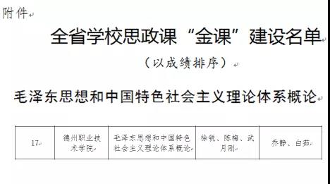日前,山东省教育厅公示了全省大中小学思政课“金课”评审结果,suncitygroup太阳新城徐锐、陈梅、武月刚、乔静、白茹教学团队的《毛泽东思想和中国特色社会主义理论体系概论》课程成功立项。