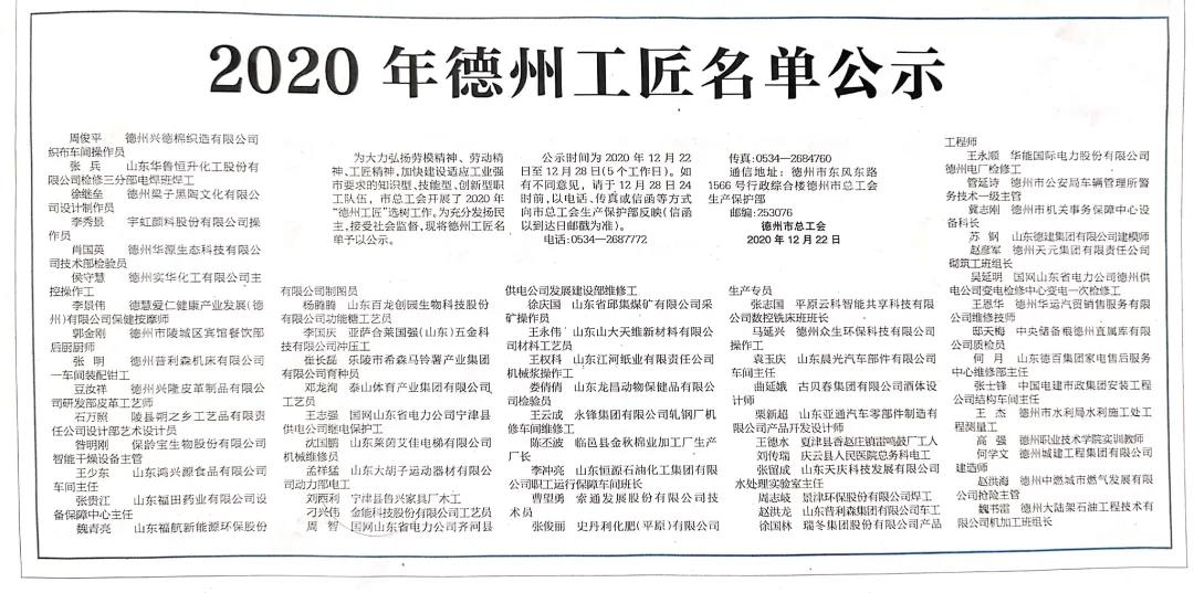 为大力弘扬劳模精神、劳动精神、工匠精神,加快建设适应工业强市要求的知识型、技能型、创新型职工队伍,德州市总工会开展了2020年“德州工匠”选树工作。经县市区工会工委推荐、基层公示、资格审查、专家评审、网络投票,最终确定60名人选。经社会公示后将命名为“德州工匠”荣誉称号。