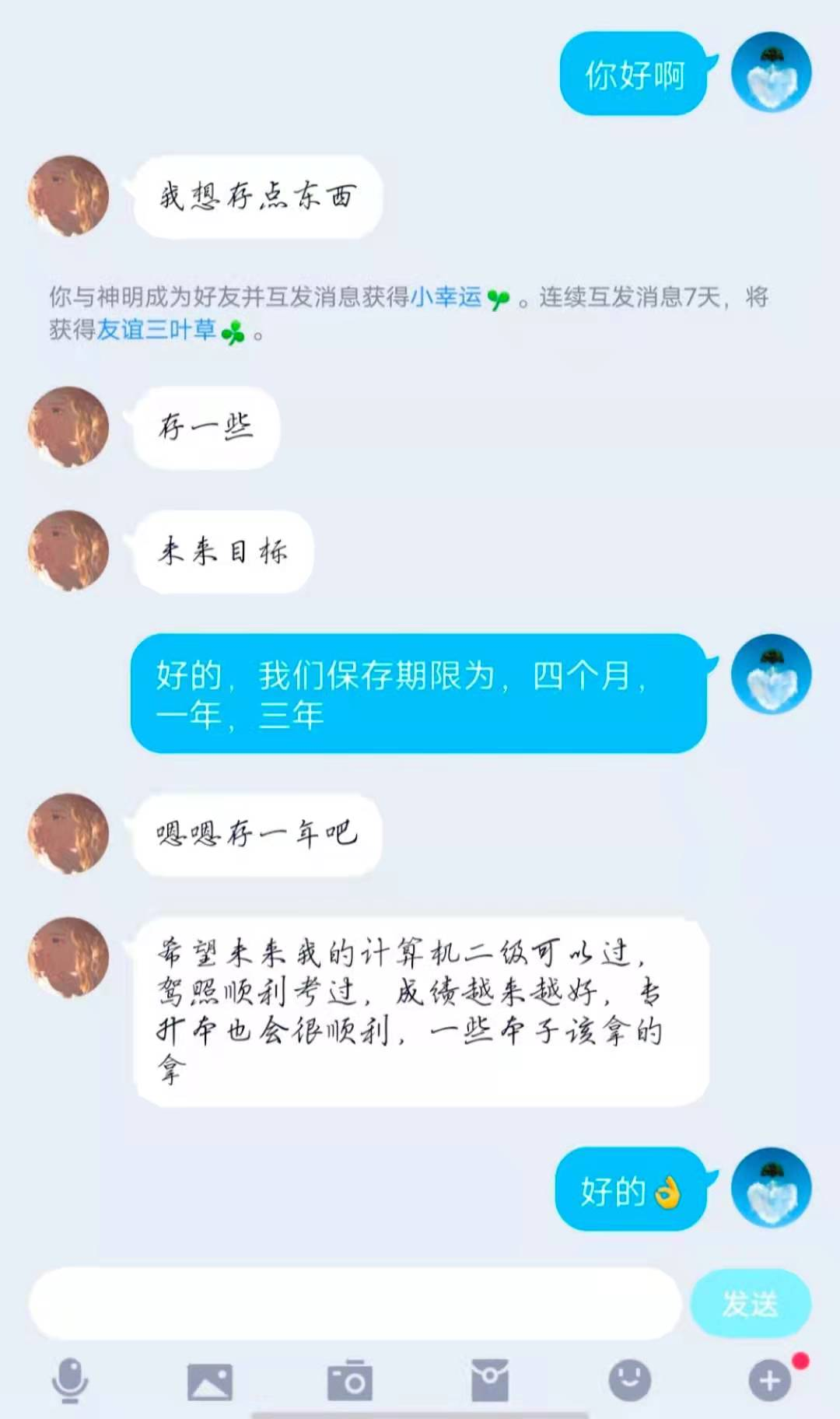 在“时空胶囊”版块,同学们可以写下近期目标并设定保存时间发送至此,“时空胶囊”将按照当初设定的保存时间按时返还给本人,这一栏目旨在督促大学生有序管理大学生活,引发学生思考未来,提醒学生不忘初心,时常反思自我。