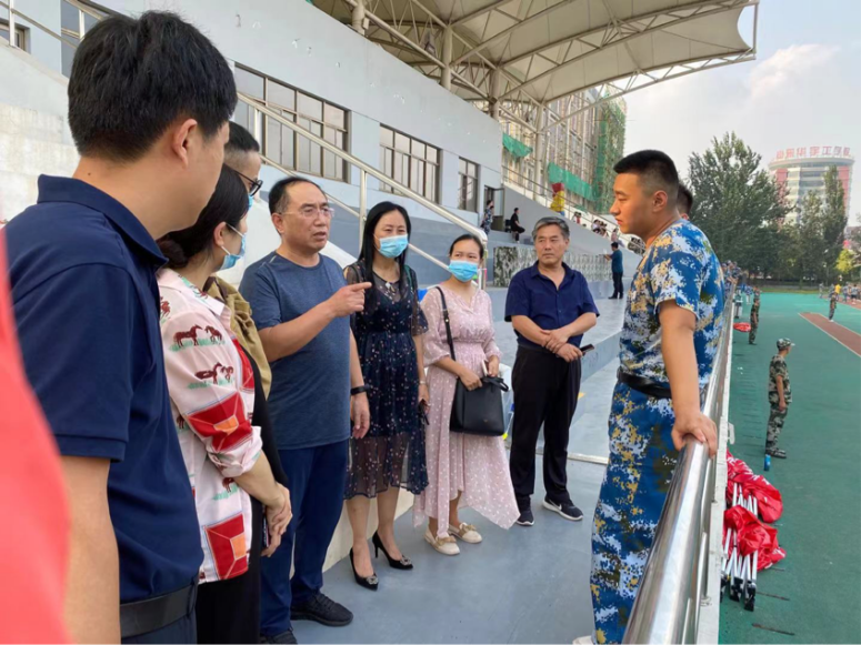 9月13日下午,经济管理系党总支书记崔建强、专职副书记李长青带领学生科科长孙建、副科长尚志锋及新生辅导员老师来到运动场检验新生军训情况。
