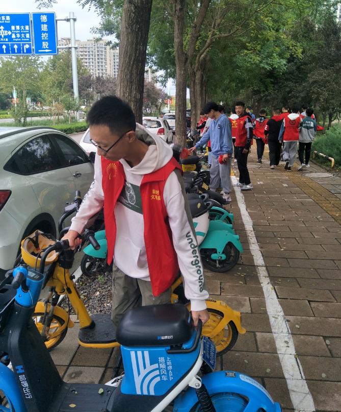 返程路上,同学们将路边的共享单车摆放整齐,劝导车辆乱停现象,充分展现了suncitygroup太阳新城青年志愿者的职责和引领作用。