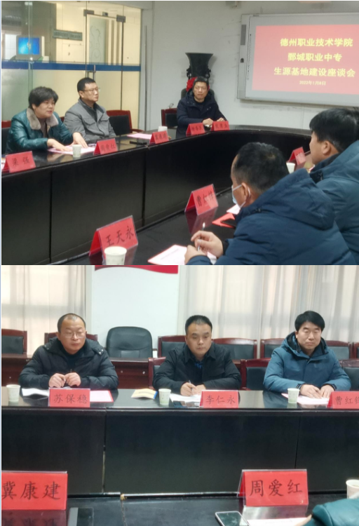 会上,周爱红代表学校向李仁永一行的到来表示欢迎,她简要介绍了我校近年来在专业群建设、技能大赛、教科研、招生就业等方面工作开展和取得的成绩,她详细介绍了我校出台的生源基地建设管理办法,希望双方坚持“资源共享、优势互补、平等自愿、互利双赢”的原则,挖掘合作潜力,拓展合作领域,我校愿意在推动人才培养、师资队伍、技能大赛、专业建设等方面提供帮助,贡献徳职力量。李仁永详细介绍了鄄城职业中专的校史和校情,他表示,鄄城职专与我院已经有了较长的合作时间,希望通过考察交流夯实合作基础,借助我校的优势职教资源,在专业建设、师资培训、技能训练及中高职贯通培养等方面加强合作,两校携手共同发展。