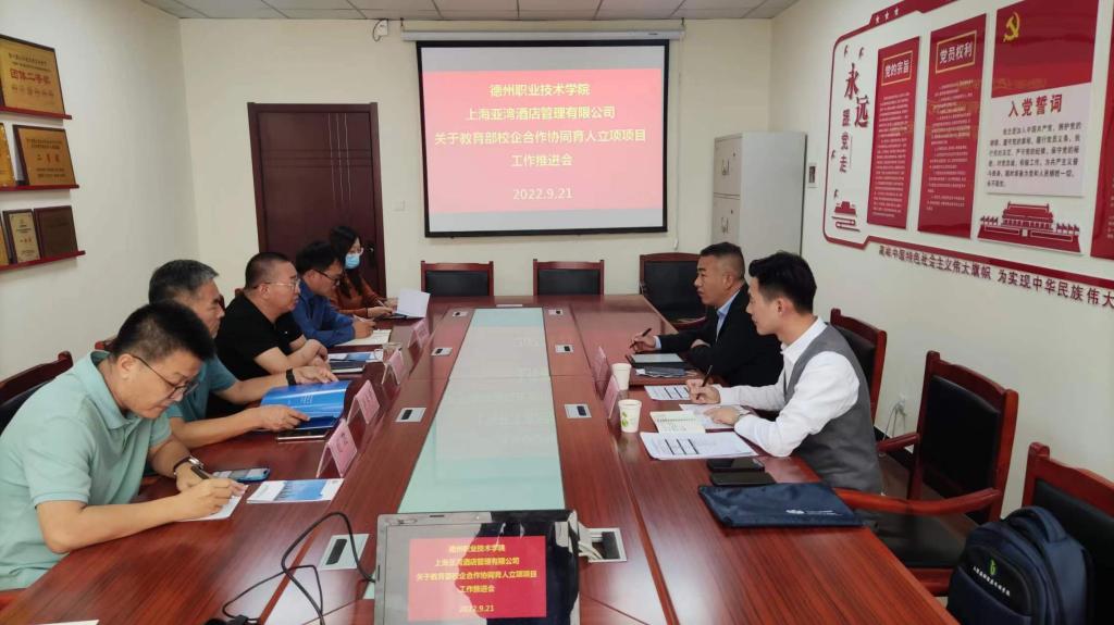 9月21日,教育部校企合作协同育人立项项目推进会在我院经管系召开。经管系主任杨京智、上海亚湾酒店管理有限公司总经理王信洋、公司校企合作部总监沈敏及校企合作项目工作组成员参加了此次会议。