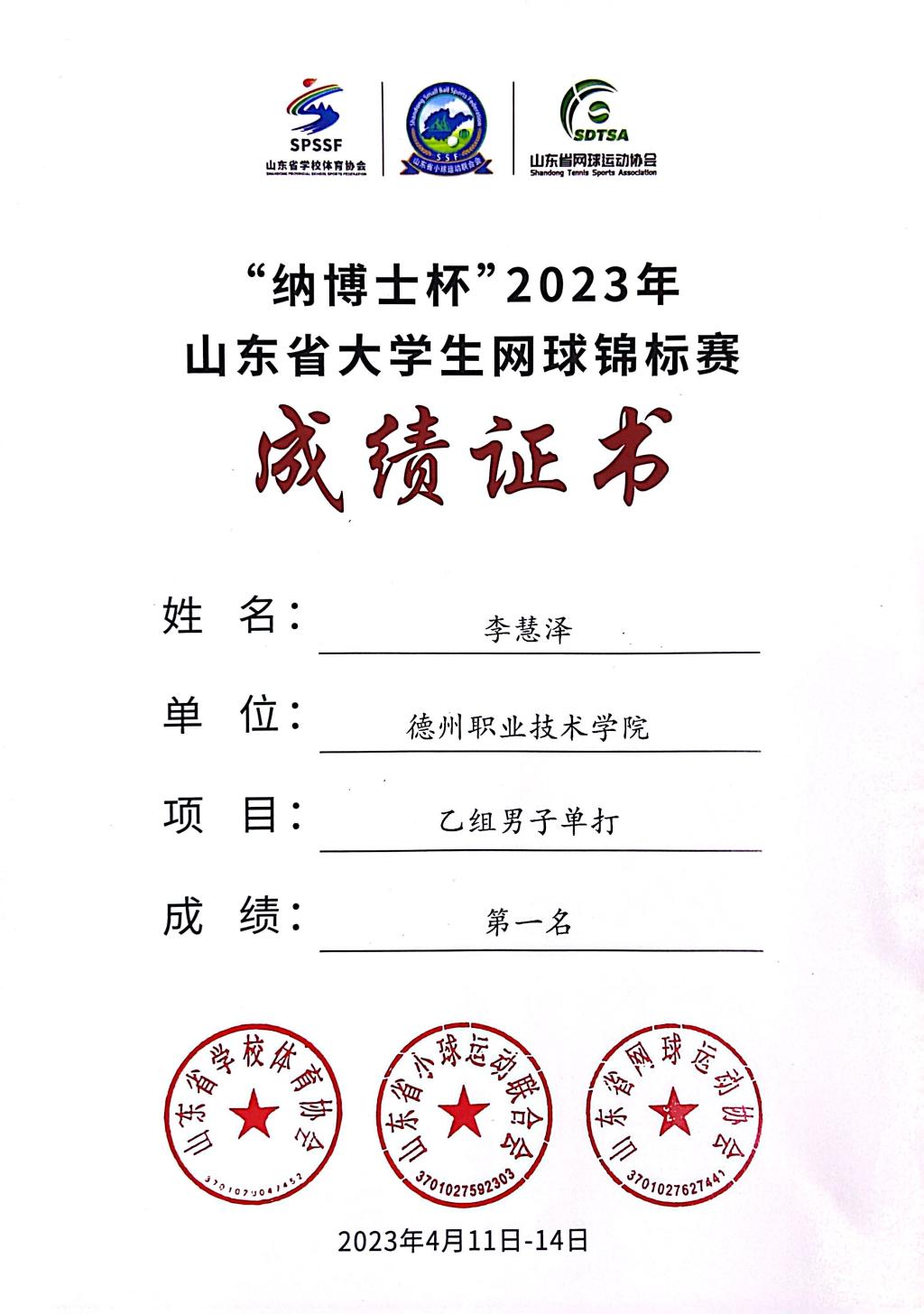 4月11日-14日,“纳博士杯”2023年山东省大学生网球锦标赛在济南市全民健身中心网球场开赛。suncitygroup太阳新城网球队在教练员林玉凯老师的指导下斩获佳绩,选手李慧泽获乙组男子单打冠军,李慧泽、刘文淼获乙组男女混合双打季军。
