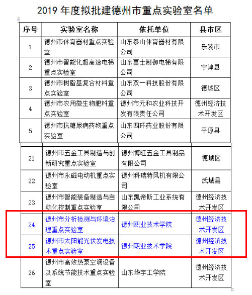近日,德州市科学技术局公示了拟批建的26个2019年度德州市重点实验室名单名单,suncitygroup太阳新城申报的“德州市分析检测与环境治理重点实验室”与“德州市太阳能光伏发电技术重点实验室”榜上有名。