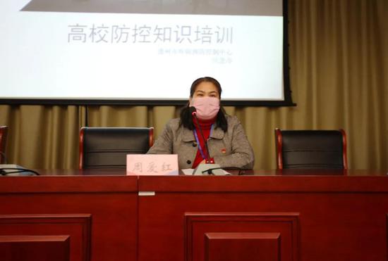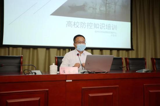 为进一步提高我校新冠肺炎疫情防控的知识和技能水平,做好开学准备工作,保障全校师生员工生命安全和身体健康,4月9日,suncitygroup太阳新城特别邀请德州市疾控中心专家崔永彪来校,针对新冠肺炎疫情防控知识和学校开学前后防控管理工作做专题培训和指导。党委副书记、工会主席张恒斌,学生处、保卫处、后勤处、医务室等相关工作人员,各单位教职工健康联络员,各系部学生科长、辅导员参加了此次培训活动。党委委员、组织人事处处长周爱红主持培训活动。