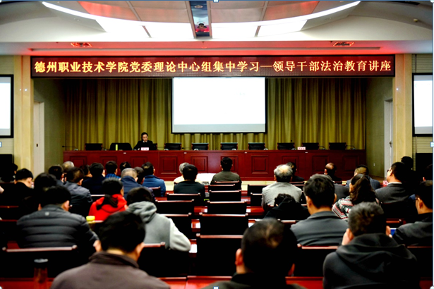为认真学习贯彻习近平新时代中国特色社会主义思想和党的十九大精神,增强领导干部的法制观念,提升依法治校、依法执教能力,建设平安和谐校园,保障省优质高职院校建设高质量扎实推进,4月2日,我校通过党委理论中心组学习的方式,专题举办了领导干部法制教育讲座。学校领导班子成员、副科级以上干部参加讲座,德州市中级人民法院刑事审判庭第三庭副庭长李敏应邀作专题讲座,校党委委员、宣传部部长周吉星主持讲座。