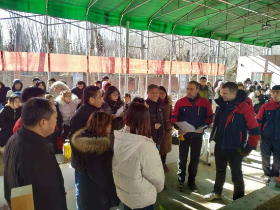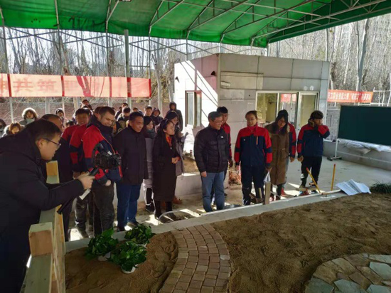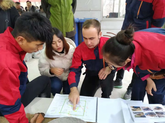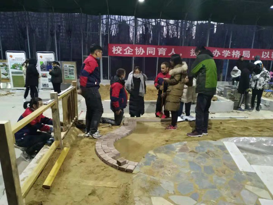 2018年12月7日,正值中国农历二十四节气中的大雪,德州的气温逼近零下十度,但并没有阻隔世界技能大赛园艺项目室外训练的热情。上午十点半,院长张同光、办公室主任郭士武在建筑园林工程系主任王刚的陪同下,亲临园林工程技术专业技能大赛训练场,对中法两校赛项训练指导老师表示慰问并亲切交流。法国福兰昂热职业高中老师Pierre Alban Sonnet(皮埃尔·奥尔本·索内)和Jean Baptiste Mauboussin(让·巴蒂斯特·蒙布索)向在场的学校领导介绍了本次训练的时间安排、作品特点以及弧形驳岸、条石汀步、碎拼铺装等细节布置,随后张院长参观了法国老师及指导的suncitygroup太阳新城学生的园艺作品。