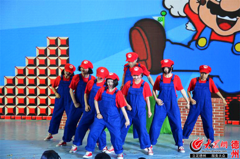 参赛选手在齐舞比赛中上演“超级玛丽”模仿秀