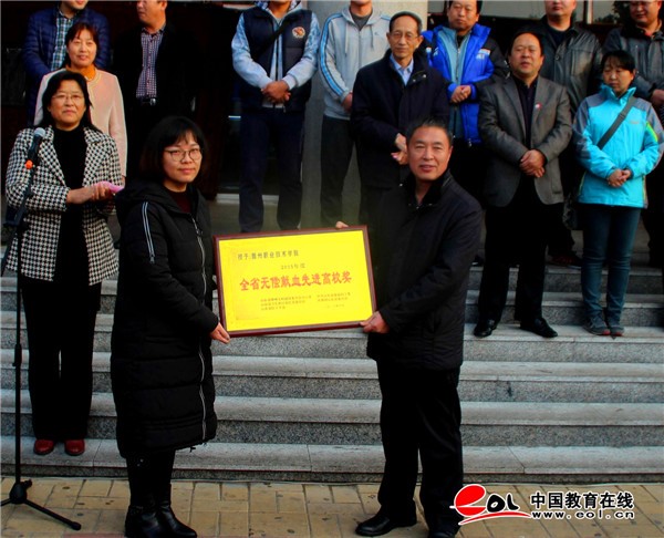 德州市中心血站党支部书记、站长王明才,站长助理张晓云分别为我校先进集体、先进个人代表颁了奖。学生代表机械系宗树志同学发了言。