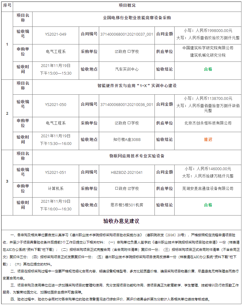 2021—2022学年第一学期第12周招标采购项目验收结果