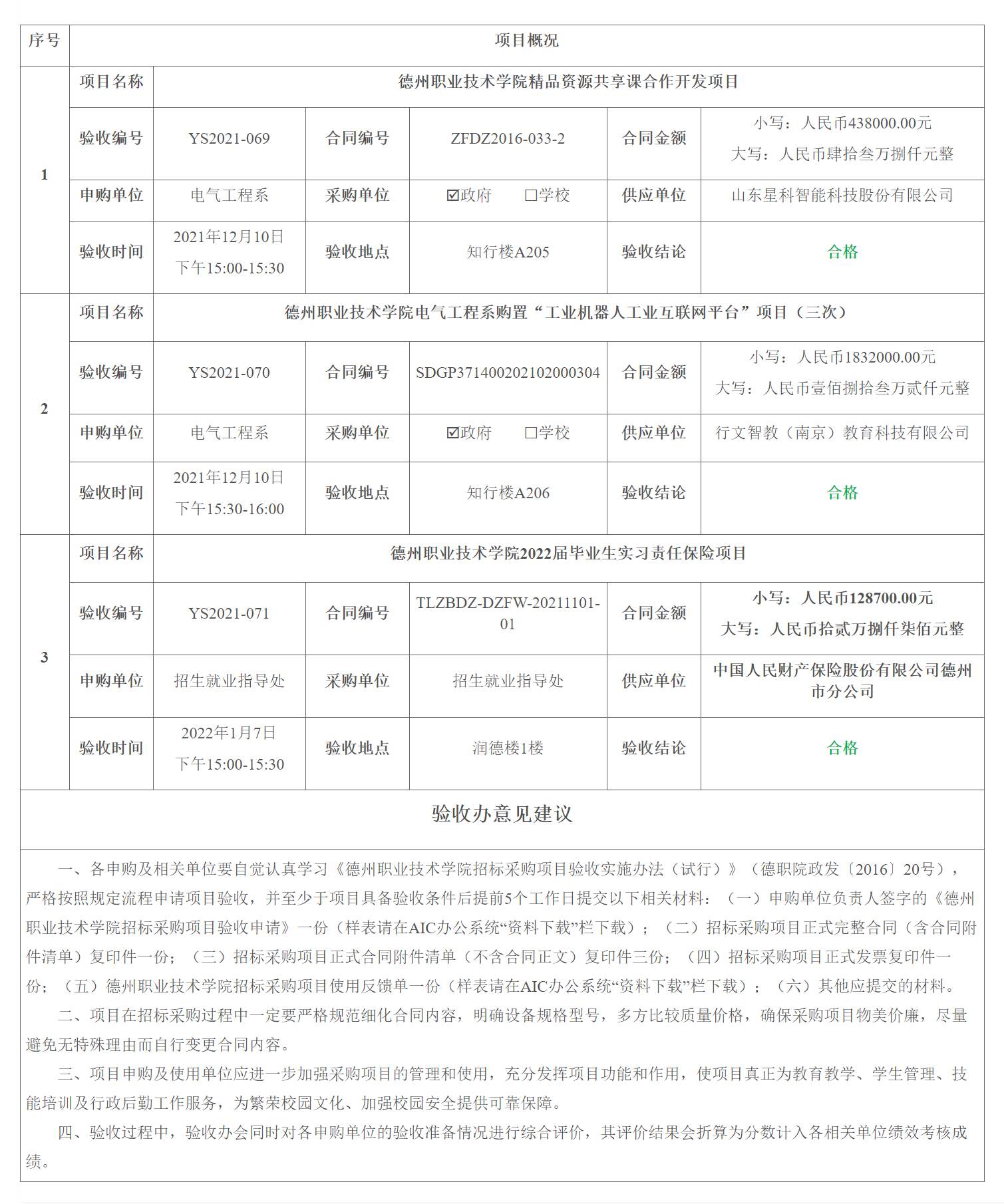 2021—2022学年第一学期第15周招标采购项目验收结果