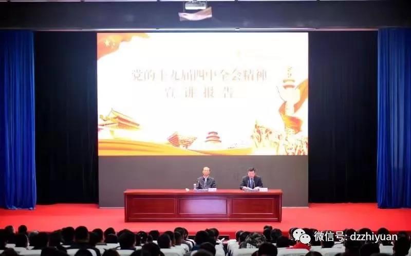 12月4日,德州市委书记陈勇来我校宣讲党的十九届四中全会精神。市委常委、组织部长赵艺丁,德城区委书记巩洪波出席活动;市委办、政研室、行政审批服务局主要负责同志,市委机关第一党支部、德城区黄河涯镇焦庄社区党员和群众代表,校领导张恒斌、陈章侠、张苹、郭士武、周爱红,全校党员干部和师生代表参加宣讲会。校党委书记樊兆杰主持。