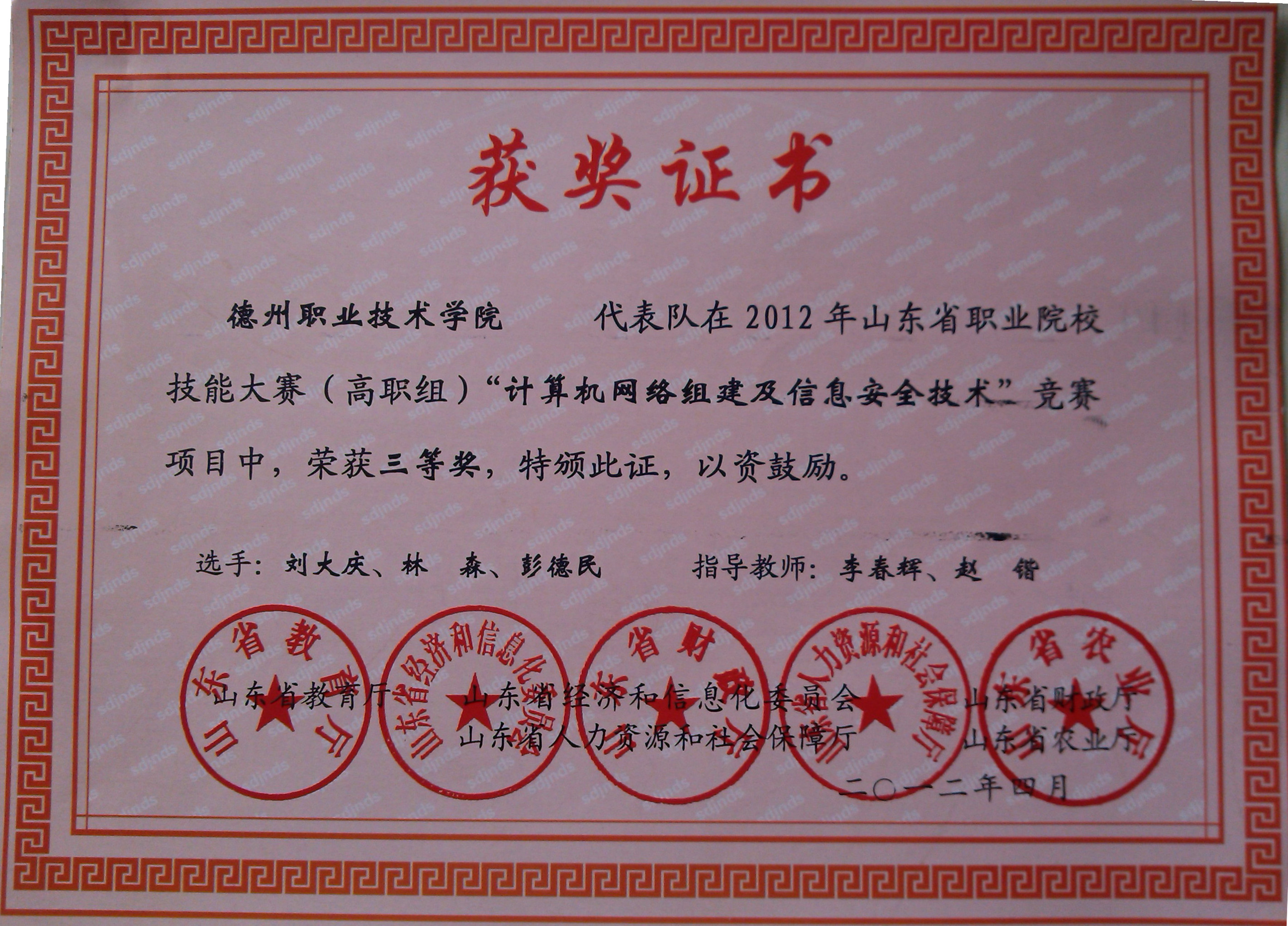 2012年4月18日,2012年山东省职业院校技能大赛高职组计算机网络组建与信息安全技术项目竞赛在潍坊职业学院开赛。来自全省42所高职院校的126名学生参加本次竞赛。竞赛采用团队方式进行,每所院校派出三名选手组成参赛团队,按顺序参加18日至19日为期两天的4场竞赛。我院计算机信息技术工程系教师李春辉、赵锴指导的该系网络系统管理专业学生刘大庆、林森、彭得民组成代表队,代表学院参赛,荣获大赛三等奖。