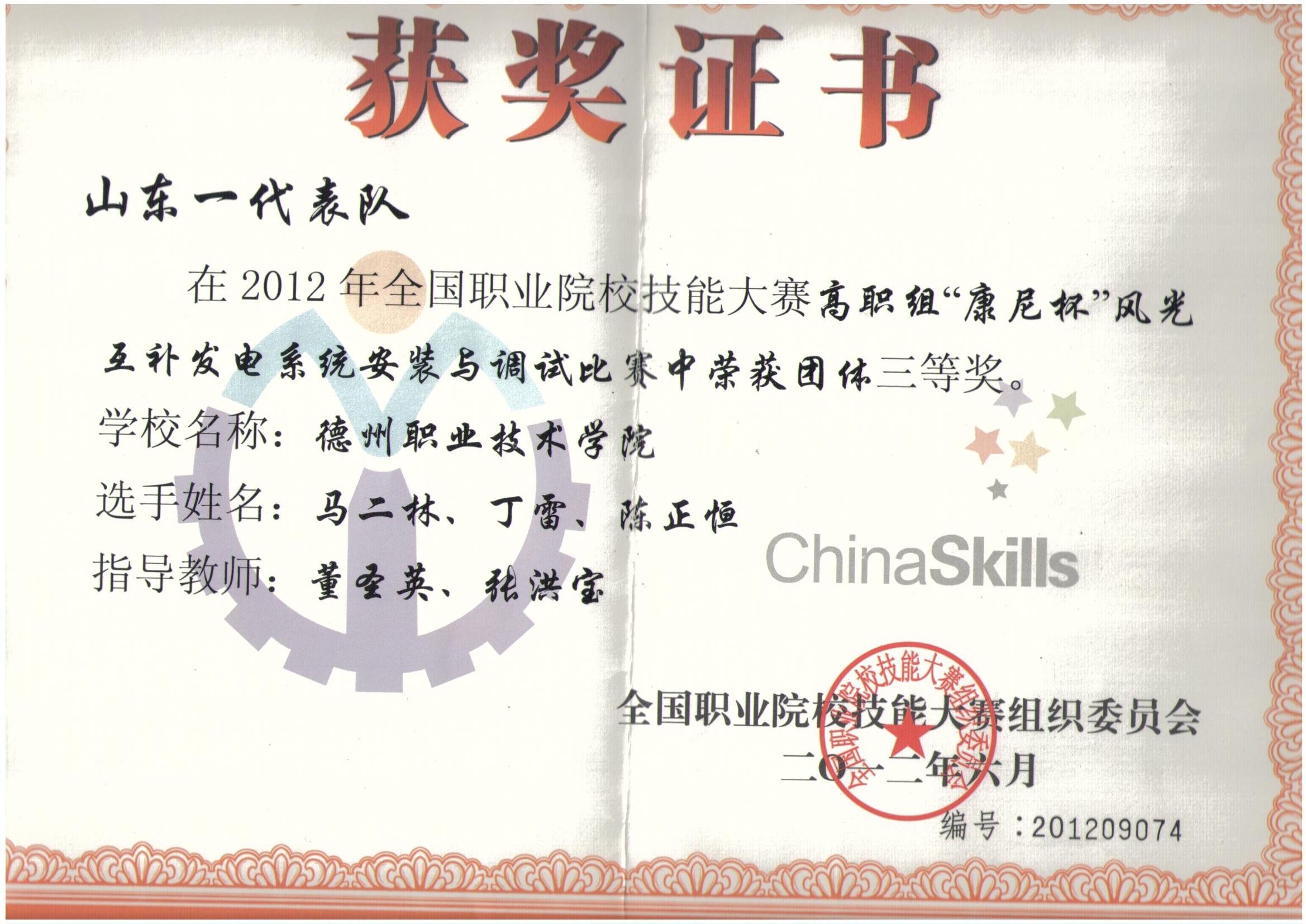 6月25日—6月29日,2012年全国职业技能大赛“风光互补发电系统安装与调试” 赛项在天津轻工职业技术学院举办。来自全国的33所院校参赛。我院电子与新能源技术工程系董胜英、张洪宝两位教师指导的学生马二林、丁雷、陈正恒组成山东一队代表队参赛,最终荣获全国三等奖,这是我院首次参加该项赛事。